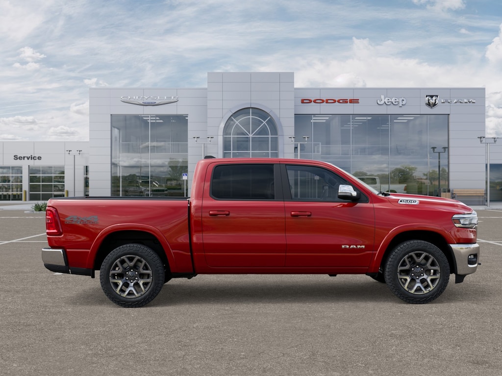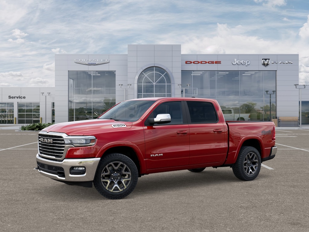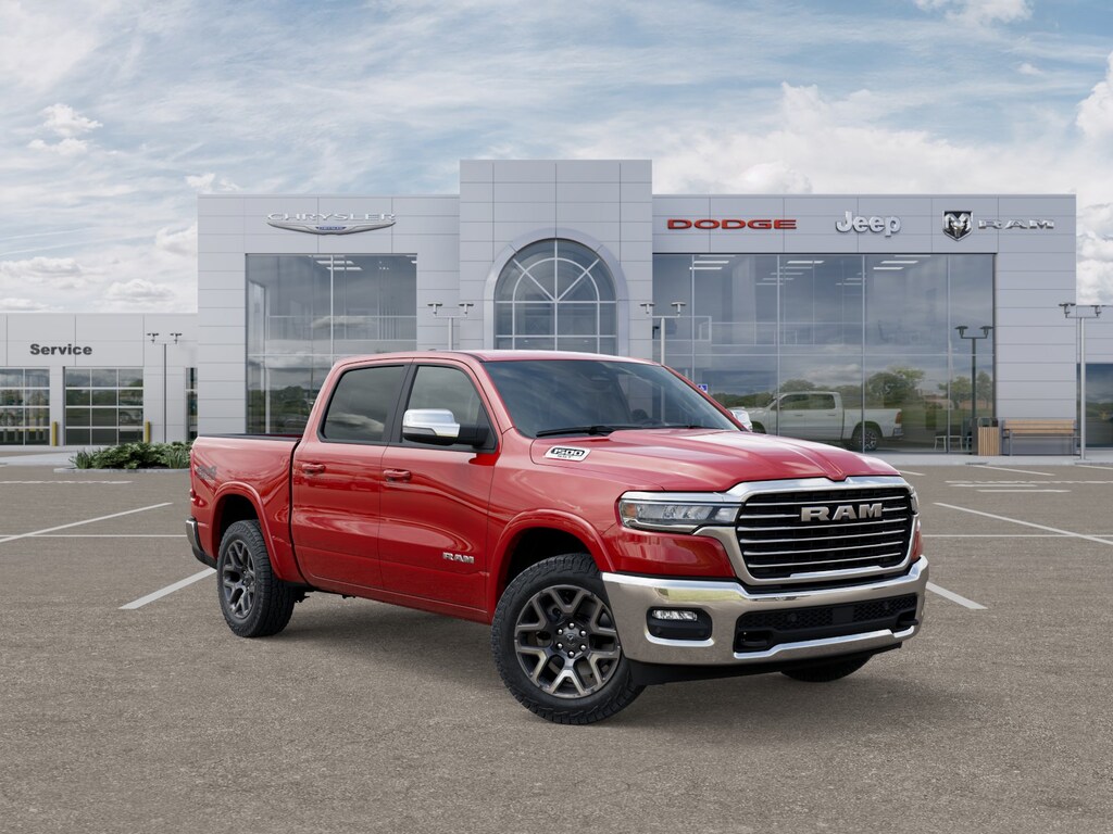 Flame Red Clearcoat 2025 Ram 1500 Laramie 4WD 8-Speed Automatic 3.0L I6 NON SMOKER, REAR CAMERA, APPLE CARPLAY/ANDROID AUTO, BLUETOOTH, 10 Speakers, 3.55 Rear Axle Ratio, 33 Gallon Fuel Tank, 4-Wheel Disc Brakes, 4G LTE Wi-Fi Hot Spot, ABS brakes, Air Conditioning, All Plant-Installed Decals, Alloy wheels, AM/FM radio: SiriusXM with 360L, Apple CarPlay, Apple CarPlay/Android Auto, Audio memory, Auto High-beam Headlights, Auto-dimming door mirrors, Auto-dimming Rear-View mirror, Automatic temperature control, Brake assist, Bumpers: chrome, Chrome Exterior Mirrors, Compass, Connected Travel & Traffic Services, Connectivity - US/Canada, Delay-off headlights, Driver door bin, Driver vanity mirror, Dual front impact airbags, Dual front side impact airbags, E-Locker Rear Axle, Electronic Stability Control, Falken Brand Tires, Front anti-roll bar, Front Center Armrest w/Storage, Front dual zone A/C, Front Extra HD Shock Absorbers, Front fog lights, Front License Plate Bracket, Front reading lights, Front wheel independent suspension, Fully automatic headlights, Garage door transmitter, Google Android Auto, GPS Antenna Input, GPS Navigation, HD Radio, Heated door mirrors, Heated front seats, Heated rear seats, Heated steering wheel, Illuminated entry, Integrated Voice Command w/Bluetooth, Laramie Level 1 Equipment Group, Leather steering wheel, Leather Trim 40/20/40 Bench Seat, Low tire pressure warning, Memory seat, MOPAR Front & Rear Rubber Floor Mats, Navigation System, Occupant sensing airbag, Off Road Decals, Off Road Group, Outside temperature display, Overhead airbag, Overhead console, Panic alarm, ParkView Rear Back-Up Camera, Passenger door bin, Passenger vanity mirror, Power door mirrors, Power driver seat, Power passenger seat, Power steering, Power windows, Quick Order Package 21H Laramie, Radio data system, Radio: Uconnect 5 Nav w/12.0" Display, Rain Sensitive Windshield Wipers, Raised Ride Height, Rear anti-roll bar, Rear Extra HD Shock Absorbers, Rear reading lights, Rear seat center armrest, Rear step bumper, Remote keyless entry, Remote Tailgate Release, Security system, Selec-Speed Control, SiriusXM w/360L, Speed control, Split folding rear seat, Steering wheel mounted audio controls, Tachometer, Telescoping steering wheel, Tilt steering wheel, Tow Hooks, Traction control, Trailer Brake Control, Trip computer, Turn signal indicator mirrors, USB Host Flip, Variably intermittent wipers, Ventilated front seats, Voltmeter, Wheels: 20" x 9" Premium Paint/Polish.